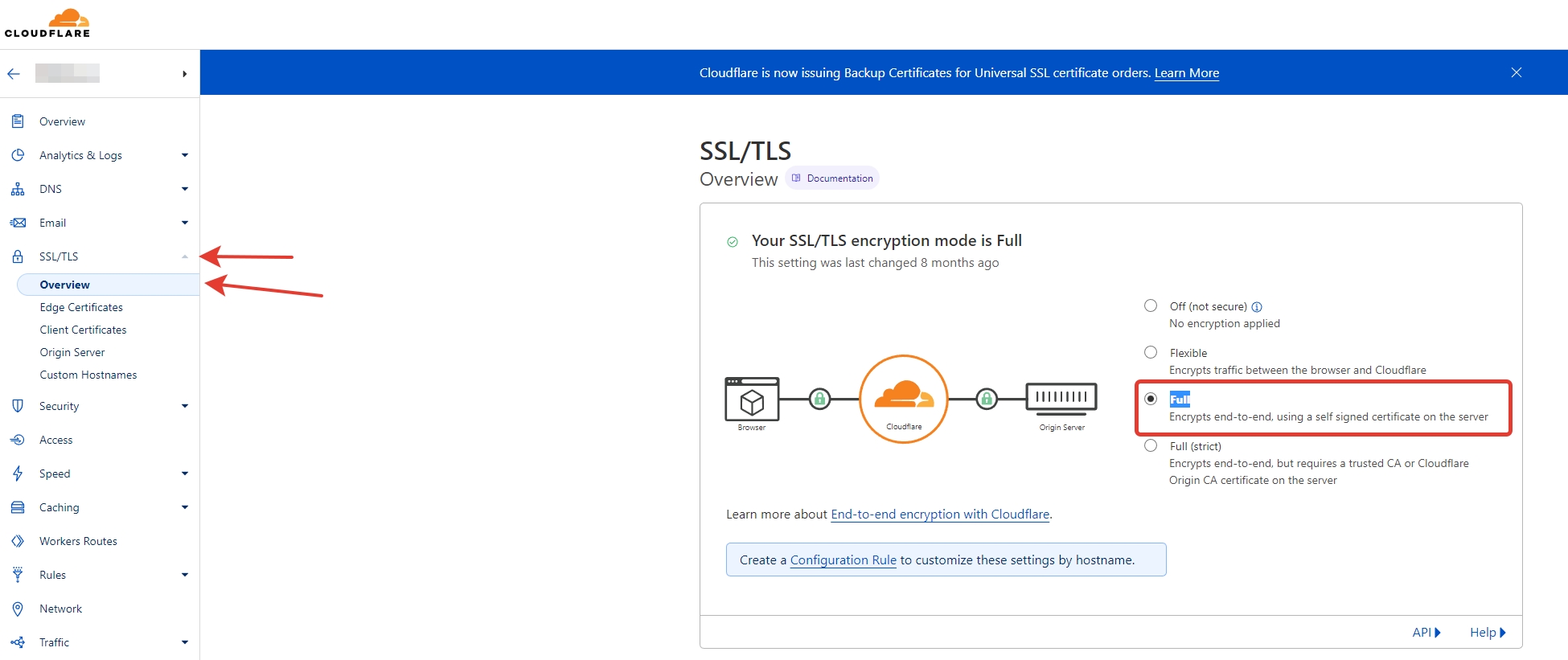 В Cloudflare перейдите в раздел «SSL/TLS» слева в меню.