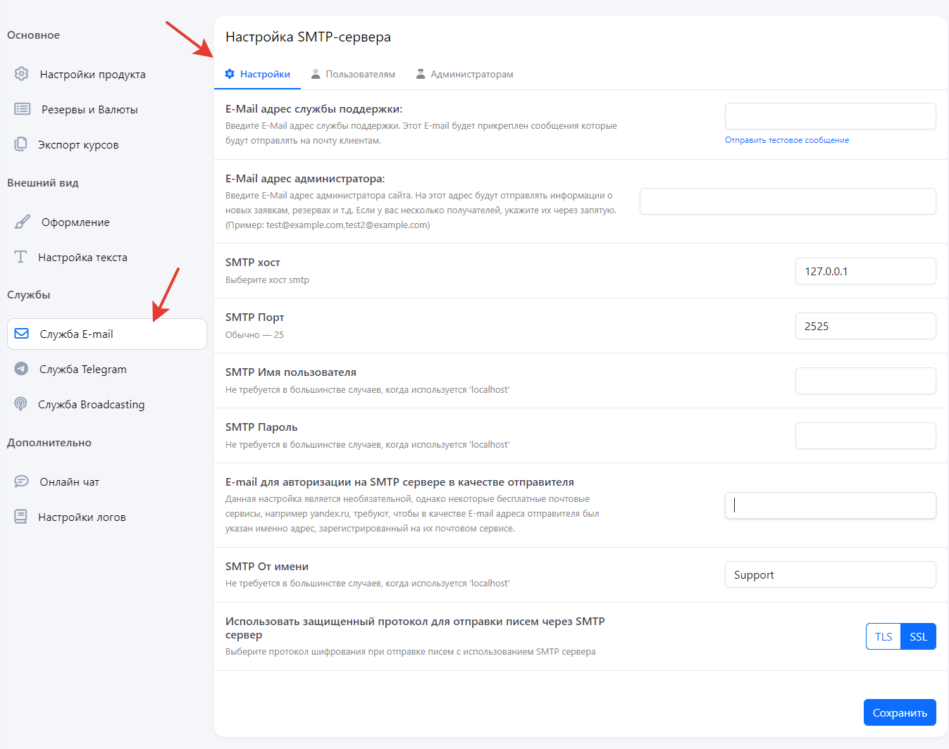SMTP от Имени - имя от которого будет отправляться письма. (Например: Support или Support НАЗВАНИЕ_ОБМЕННИКА)