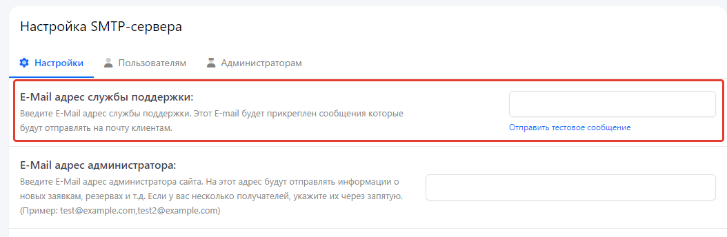 Для того чтобы протестировать соединение с SMTP сервером, в поле "E-Mail адрес службы поддержки:", укажите любой ваш действующий адрес и сохраните настройки. Далее под этим полем вы увидите кнопку "Отправить сообщение", нажмите на ее.