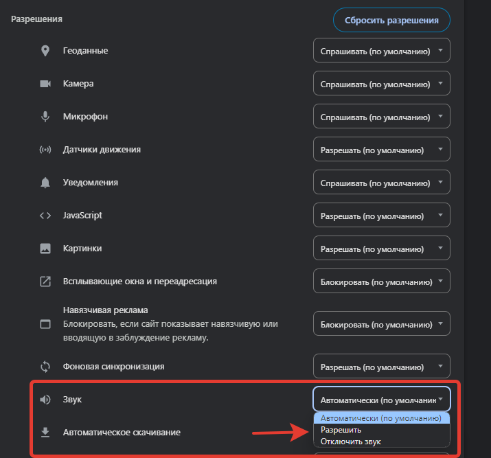 Найдите пункт «Звук» и в выпадающем списке справа выберите «Разрешить».