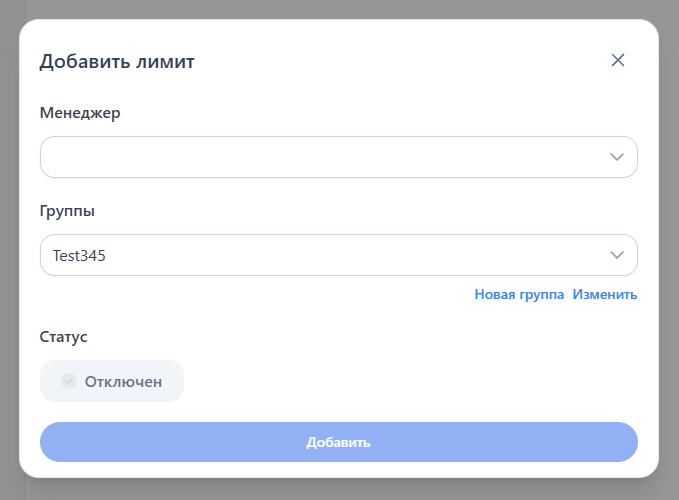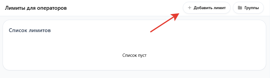 Для настройки в панели управления зайдите в раздел "Заявки — Лимиты для операторов" и нажмите на кнопку "Добавить лимит", чтобы привязать созданную группу к оператору
